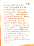 The score for Modest Epoch (9AM 11/19 – 9PM 11/21) begins in solitude at 9AM, ending at 9 PM two days later. It maintains an uninterrupted presence in the gallery, bringing the daily tasks of living, boredom, eating and sleeping into the total performance experience. It is an experiment in understanding how we live inside of ideas. It is a reconciliation with time. It is a measuring of inner and outer landscapes. It is a conversation between the material and the ephemeral.